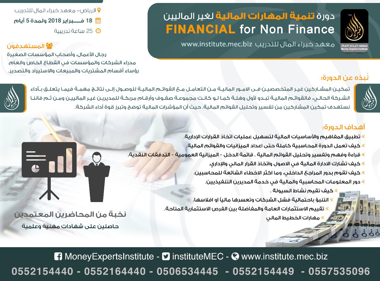 شركة خبراء المال للتدريب Money Experts Company On Twitter المهارة الماليه ليست حكرا على احد يطلق معهد خبراء المال للتدريب دورة تنمية المهارات المالية لغير الماليين 18 فبراير بمقر المعهد بمدينة الرياض